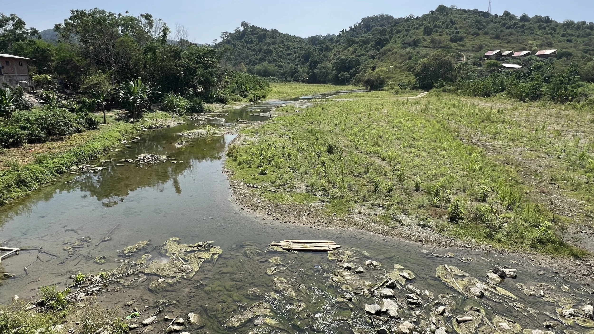 At La Entrada, the dynamics are different but equally significant. Rio Entrada drains a very small catchment and flows directly through town before reaching the sea. In this setting, local contamination is dominated by town-scale wastewater rather than large agricultural operations.
